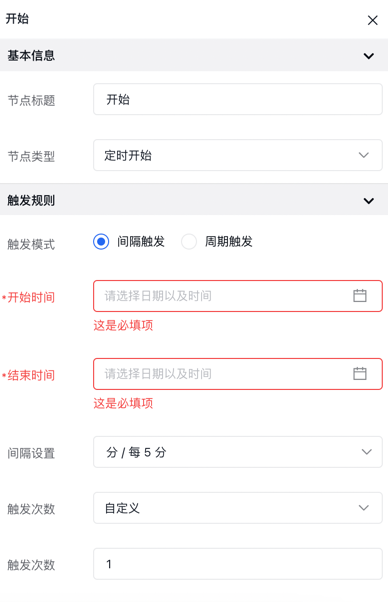 - 间隔触发:指的是在一段开始到结束时间内,以分/时/天/周为间隔单位,间隔够时长后,主动进行触发